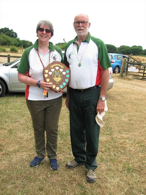 comprising 5 dozen arrows at a 60cm target face at a distance of 20 yards. 19 archers took part this year on a very sunny and hot day. Pairs were drawn on the day and the winning pair were Karen Fountaine and Chris Southall with a combined score of 984 and 24 Golds, 2nd place went to Yvonne John and Clive lane with a score of 924 and 15 Golds, and in